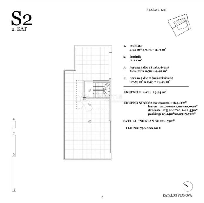 Ova suvremena dvojna kuća prostire se na tri etaže, a njezin pažljivo osmišljen raspored nudi udobnost, funkcionalnost i privatnost. Ukupna neto površina iznosi 224,73 m², a obuhvaća stambeni prostor od 184,41 m², grijani bazen od 22 m², ograđeno dvorište veličine 125,26 m² te privatno parkirno mjesto površine 23,14 m².