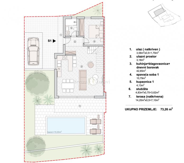 The ground floor consists of an entrance hall, a bathroom, a bedroom, and a large living room with kitchen and dining area. The living room opens up to a terrace with a south orientation, which has a large covered area and a 15 m2 swimming pool. There is a green landscaped area around the terrace, and the entire yard is bordered by an autochthonous stone wall, elevated on the eastern facade to ensure maximum privacy for the tenants.