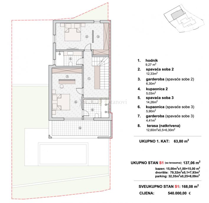 1. kat se sastoji od hodnika, 2 spavaće sobe i 2 kupaonice te natkrivene terase od 12,60 m2.