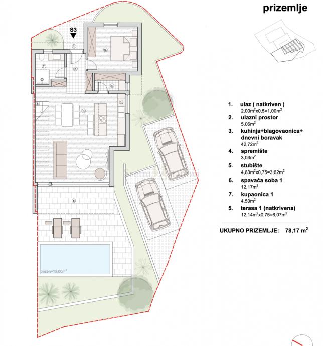 Prizemlje se sastoji od ulaznog hodnika, 1 kupaonice, 1 spavaće sobe te velikog dnevnog boravka s kuhinjom i blagovaonom, iz kojeg se izlazi na terasu s velikim natkrivenim dijelom i bazenom od 15 m2. Oko terase se nalazi zelena uređena površina, a cijelo je dvorište omeđeno autohtonim kamenim zidom, povišenim na pročeljima koja graniče sa susjednim terasama kako bi se osigurala maksimalna privatnost stanara spram susjeda.