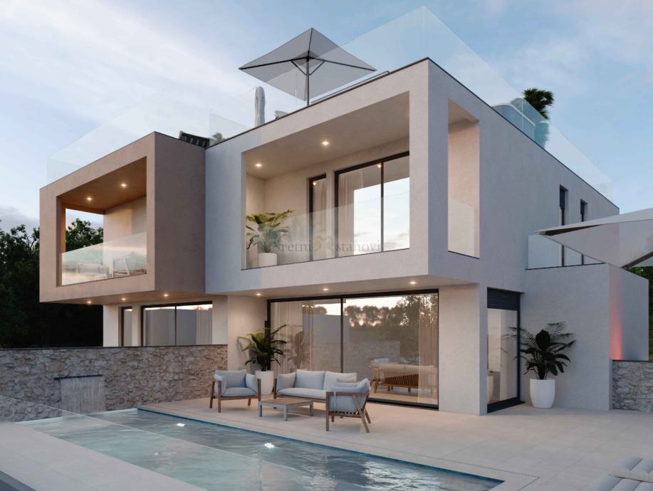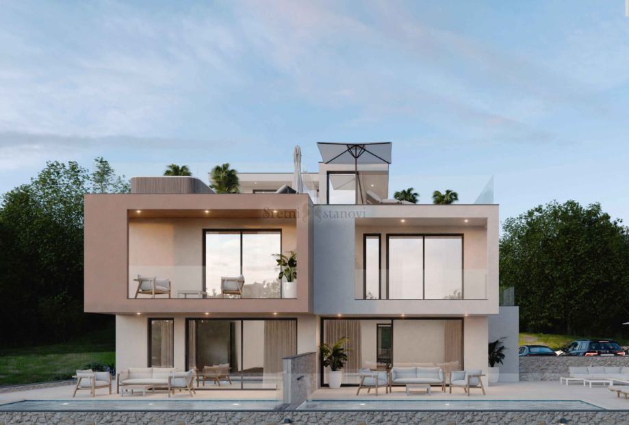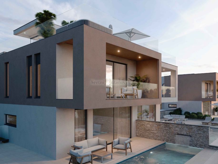 This beautiful and luxurious house with a swimming pool, a sea view and a view to the whole Vodice town is for sale, as part of a duplex houses, in the town of Vodice.