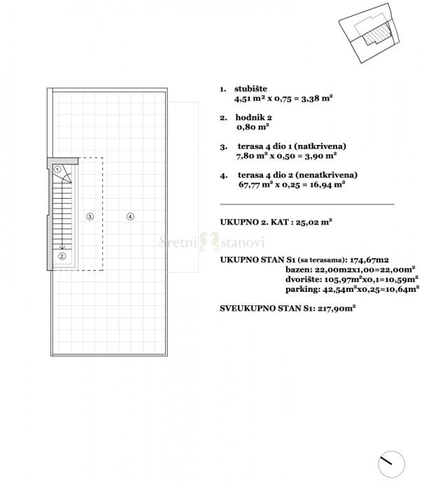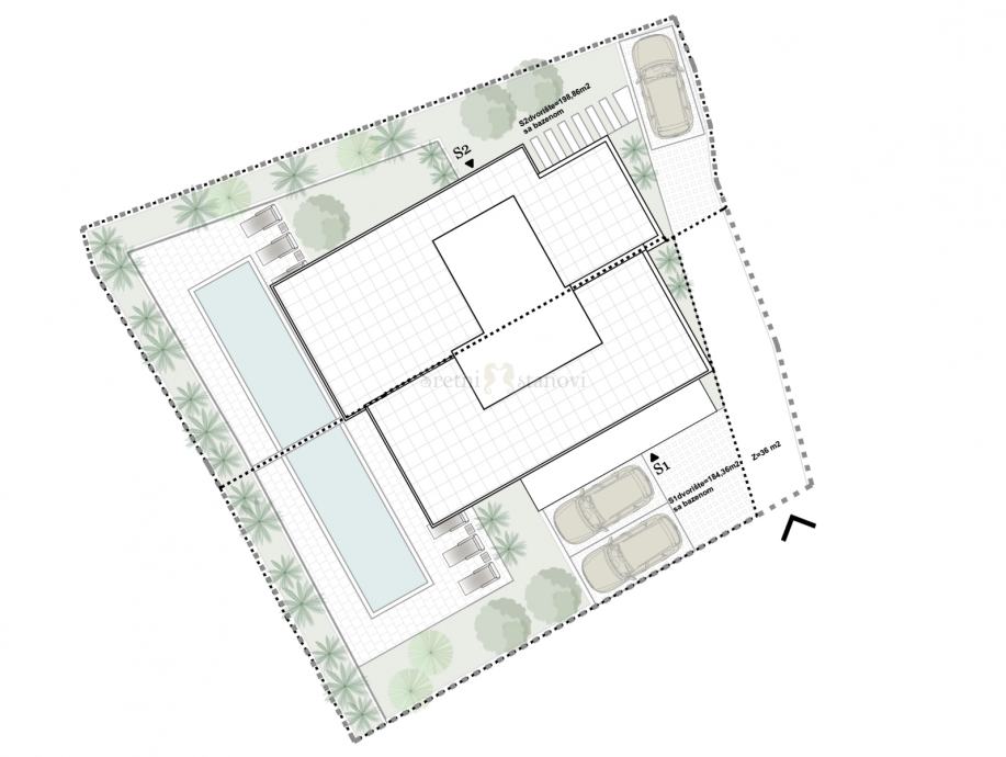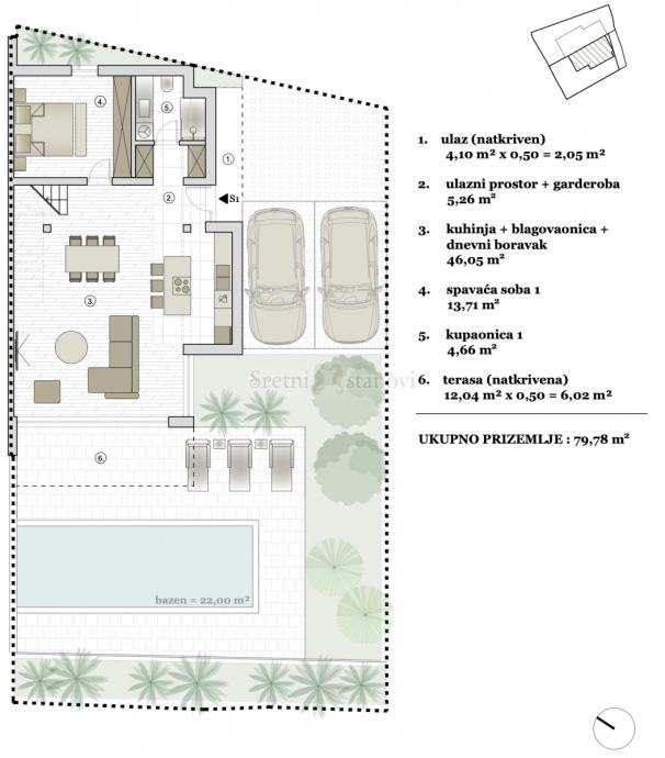 Površina kuće je 174,67m2. Bazen ima 22 m2. Dvorište ima 105,97 m2. 2 privatna parkirna mjesta u okućnici kuće zajedno imaju 42,54 m2.