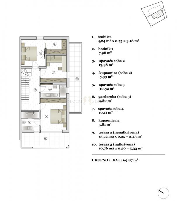 1. kat se sastoji od hodnika, 3 spavaće sobe i 2 kupaonice, natkrivene terase od 10,76 m2 i nenatkrivene terase od 13,72 m2.