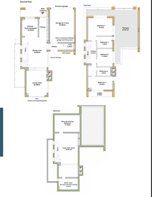 be adapted into an area for working, fitness or guests, underfloor heating, sauna (8 person), bathroom, boiler room (for house and pool heating).