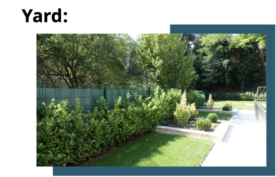 uživanje u zelenilu. Automatsko navodnjavanje svih zelenih površina te profesionalna usluga održavanja vrta i bazena. Vrt i dječje igralište: 200 m2. U prizemlju se nalazi garaža s dva mjesta za automobile. Ispred garaže instalirano je podno grijanje, kako bi prilaz garaži i u zimskim mjesecima bio čist od leda i snijega. Garaža i dvorišna vrata otvaraju se jednim daljinskim upravljačem. Direktna povezanost garaže i dnevnog boravka (prikladno za obitelji s malom djecom).