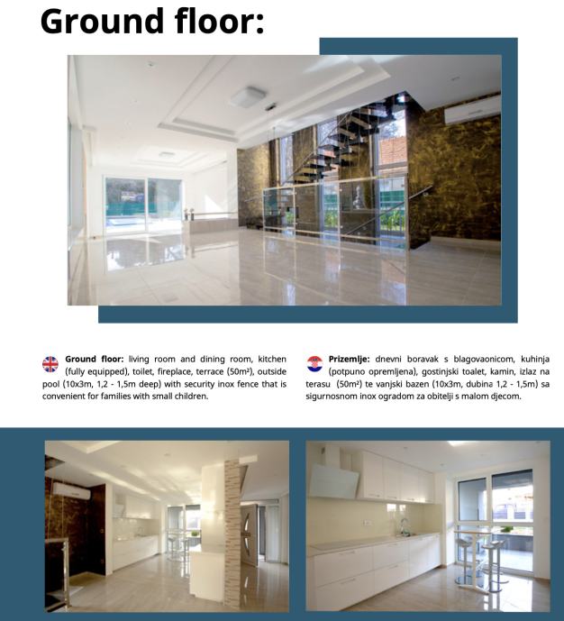 (potpuno opremljena), gostinjski toalet, kamin, izlaz na terasu (50m2) te vanjski bazen (10x3m, dubina 1,2 - 1,5m) sa sigurnosnom inox ogradom za obitelji s malom djecom te garaza za dva automobila iz koje se ulazi u kucu.