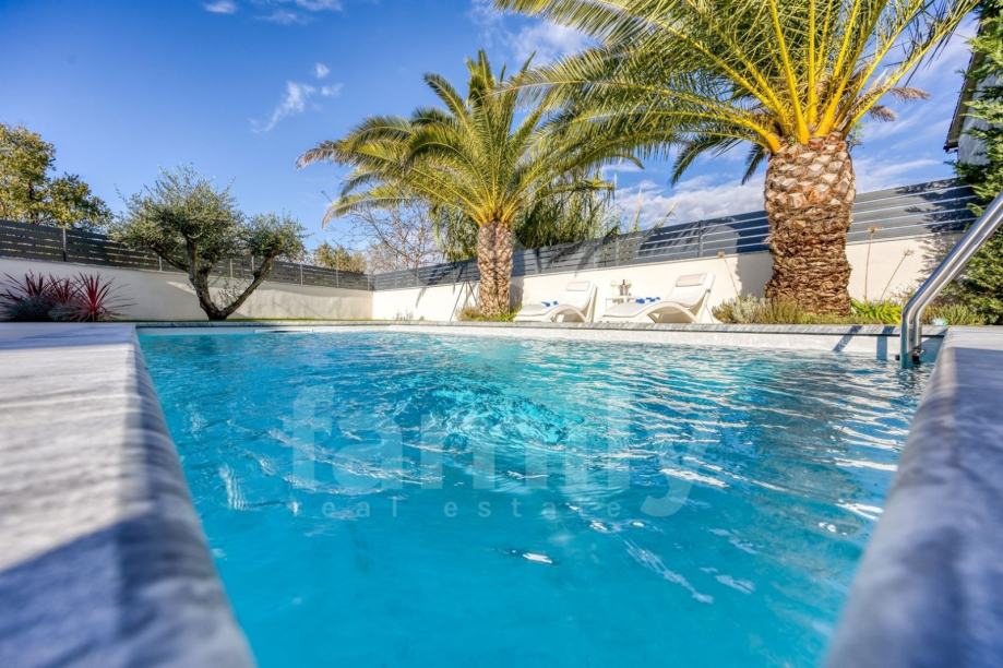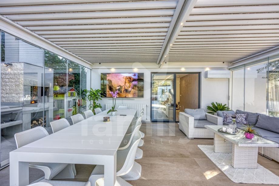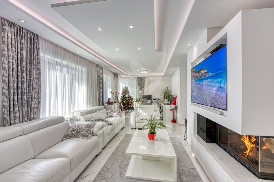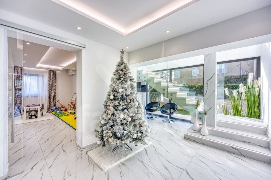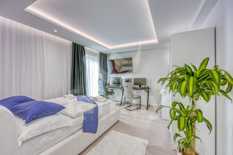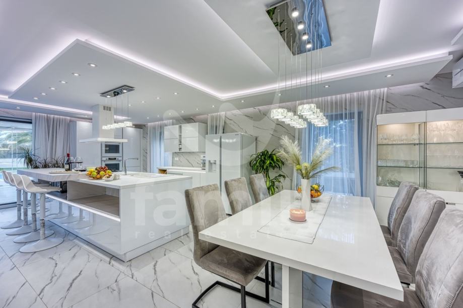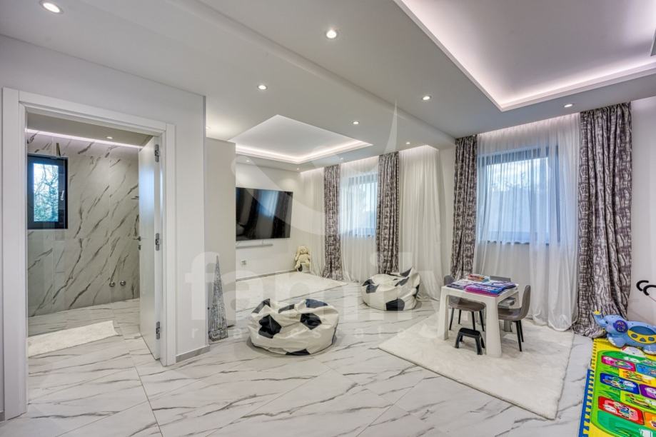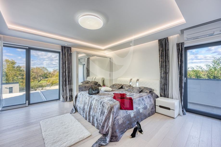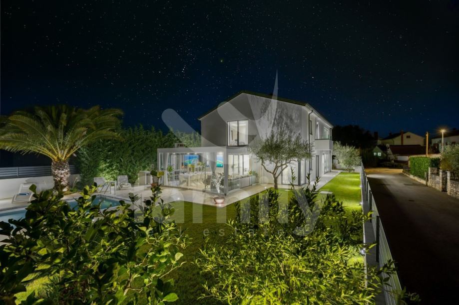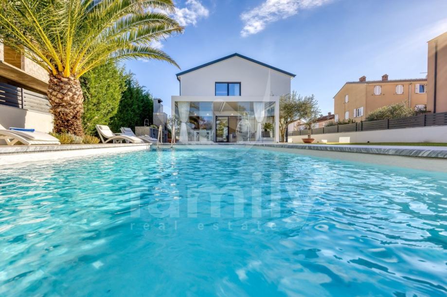 Upravo u Rovinju na 2 km od mora i starog grada smještena je ova izuzetno luksuzna, visokokvalitetna i moderna obiteljska villa. Površina vile je 358 m2 sa okućnicom 530 m2. Proteže se na dvije etaže, prizemlje i prvi kat. Vila posjeduje ukupno 5 moderno dizajniranih spavaći soba, 3 prostrane kupaonice, toalet, dva dnevna boravka od kojih je jedan smješten ispod moderne pergole, kao i luksuzno i kvalitetno opremljene kuhinje. Dizajnerski dnevni boravak je odvojen od kuhinje i blagovaonice poluotvorenim kaminom, a u kome se nalazi kvalitetna kožna garnitura rađena po mjeri isključivo za ovu vilu, dok se uz dnevni dio kuće nalazi i manji uredski prostor. "Open space" prostor podrazumijeva blagovaonicu sa potpuno kvalitetno opremljenom kuhinjom i kuhinjskim aparatima renomiranog svjetskog proizvođača, kao i minibar koji je predodređen za držanje pića na adekvatnoj temperaturi. Kuhinjski otok osim što je prostran posjeduje i profesionalni štednjak na plin sa visokokvalitetnom napom. U prizemlju je smještena i spavaća soba koja se trenutno koristi u svrhe igraonice za djecu sa vlastitom kupaonicom.