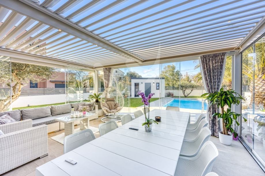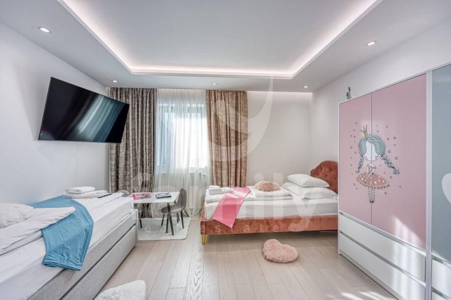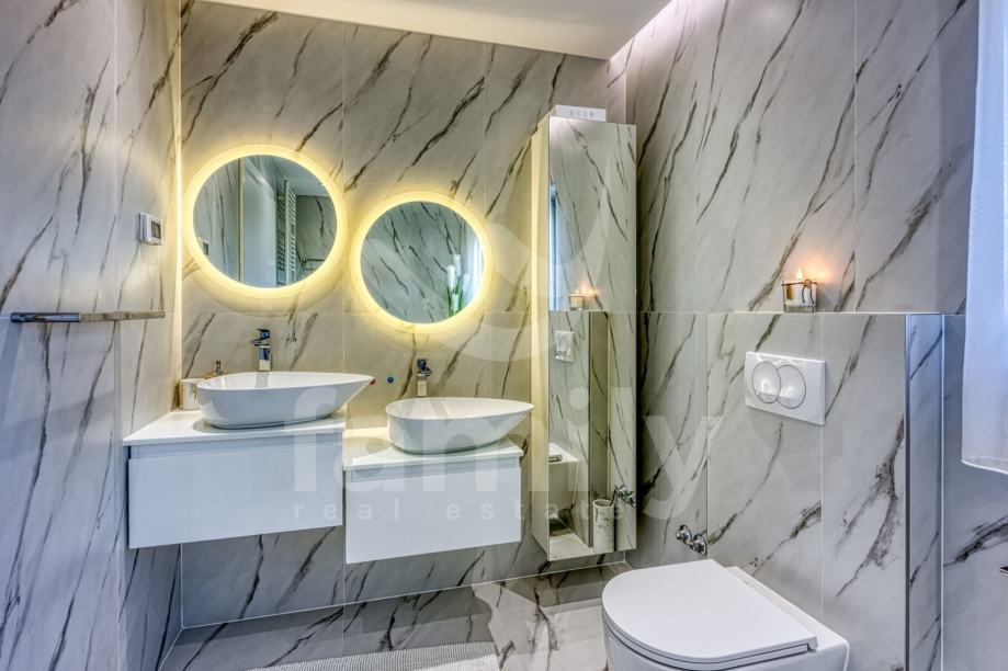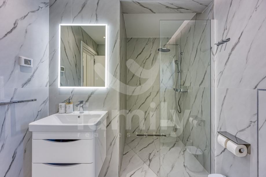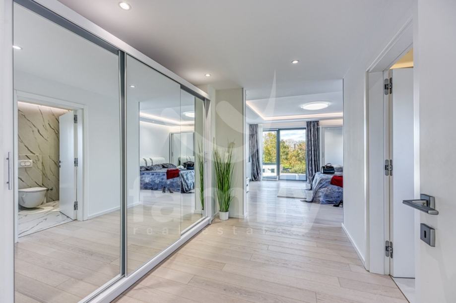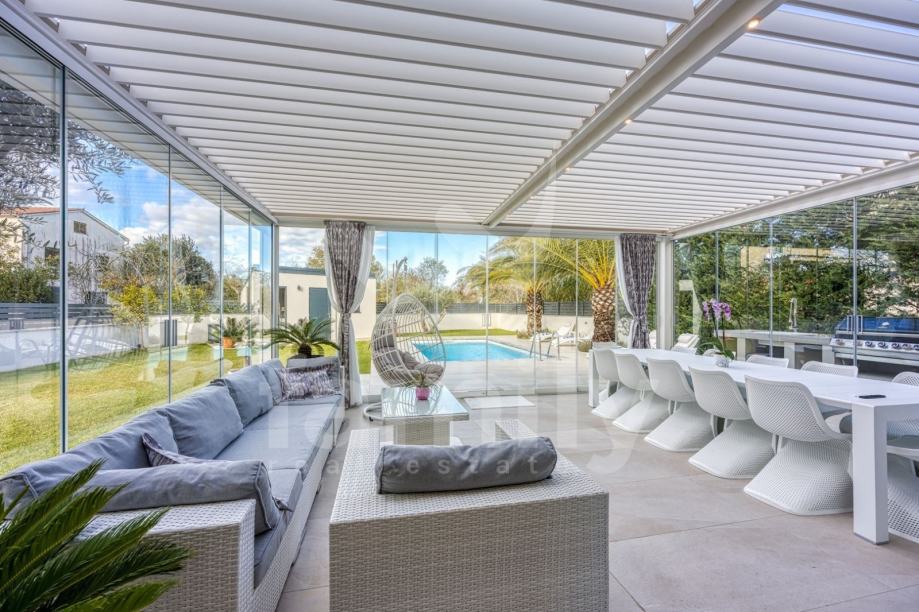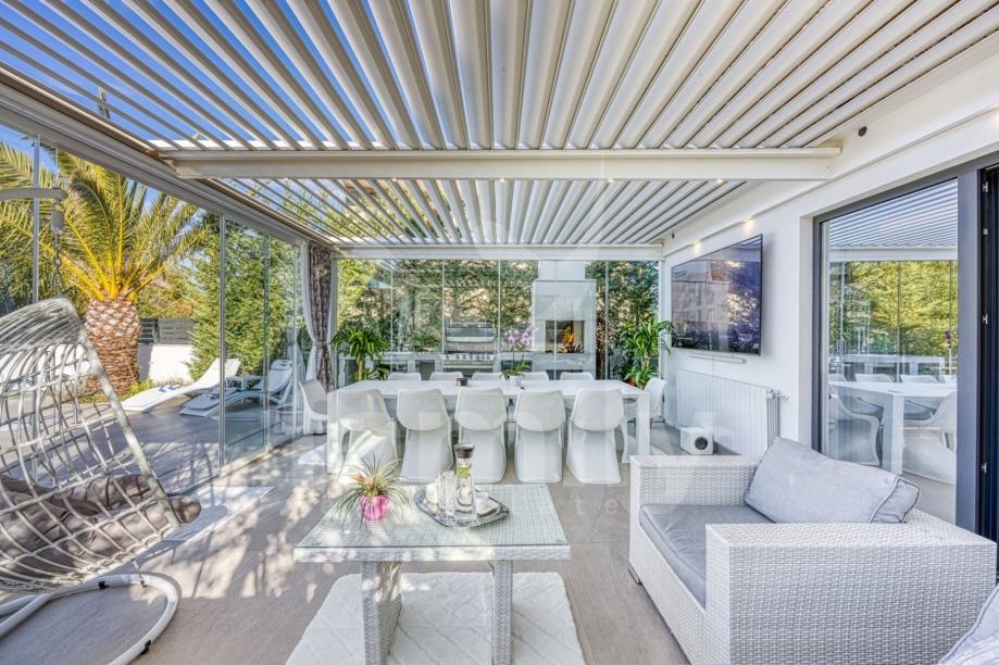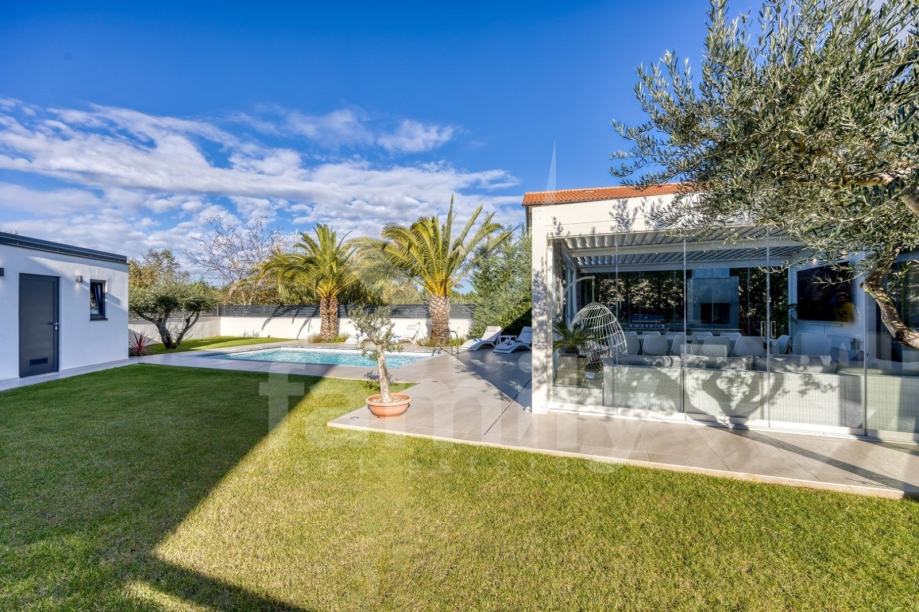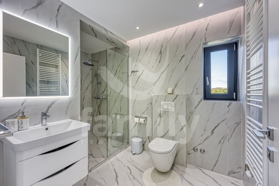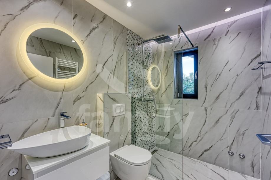 Upravo u Rovinju na 2 km od mora i starog grada smještena je ova izuzetno luksuzna, visokokvalitetna i moderna obiteljska villa. Površina vile je 358 m2 sa okućnicom 530 m2. Proteže se na dvije etaže, prizemlje i prvi kat. Vila posjeduje ukupno 5 moderno dizajniranih spavaći soba, 3 prostrane kupaonice, toalet, dva dnevna boravka od kojih je jedan smješten ispod moderne pergole, kao i luksuzno i kvalitetno opremljene kuhinje. Dizajnerski dnevni boravak je odvojen od kuhinje i blagovaonice poluotvorenim kaminom, a u kome se nalazi kvalitetna kožna garnitura rađena po mjeri isključivo za ovu vilu, dok se uz dnevni dio kuće nalazi i manji uredski prostor. "Open space" prostor podrazumijeva blagovaonicu sa potpuno kvalitetno opremljenom kuhinjom i kuhinjskim aparatima renomiranog svjetskog proizvođača, kao i minibar koji je predodređen za držanje pića na adekvatnoj temperaturi. Kuhinjski otok osim što je prostran posjeduje i profesionalni štednjak na plin sa visokokvalitetnom napom. U prizemlju je smještena i spavaća soba koja se trenutno koristi u svrhe igraonice za djecu sa vlastitom kupaonicom.