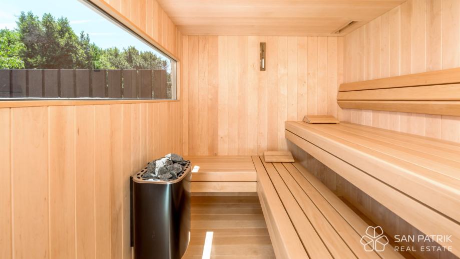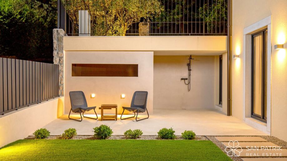 Uređena okućnica, popločana kamenom i obogaćena mediteranskim zelenilom, uključuje bazen i jacuzzi, sunčalište, vanjsku kuhinju s prostorom za roštiljanje te saunu s pogledom na more. Vila je opremljena dizalicom topline, sustavom fan coil, alarmnim sustavom i videonadzorom.