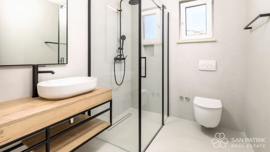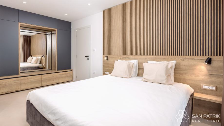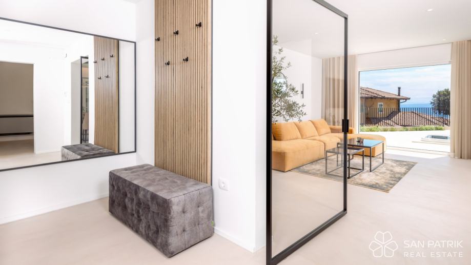 Vila se prostire na dvije etaže. U prizemlju su prostrani dnevni boravak otvorenog koncepta s kuhinjom i blagovaonicom, povezani s velikom terasom, jedna spavaća soba s kupaonicom, garderoba i gostinjski WC. Na katu su tri spavaće sobe, svaka s vlastitom kupaonicom i južno orijentiranim balkonima s panoramskim pogledom na more. Interijer je opremljen ručno rađenim namještajem po mjeri, nikada korištenim, s luksuznim mikrocementom i podnim grijanjem u svim prostorijama.