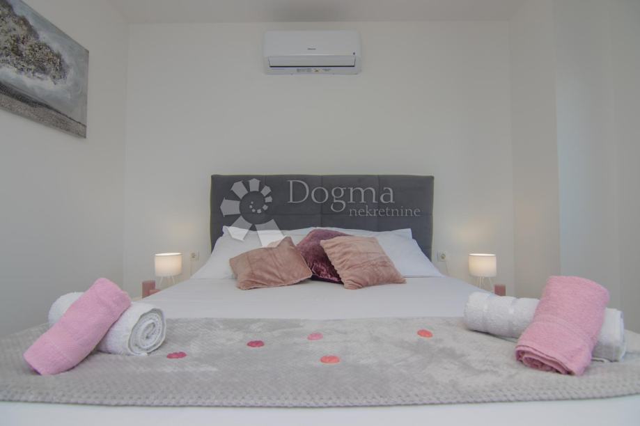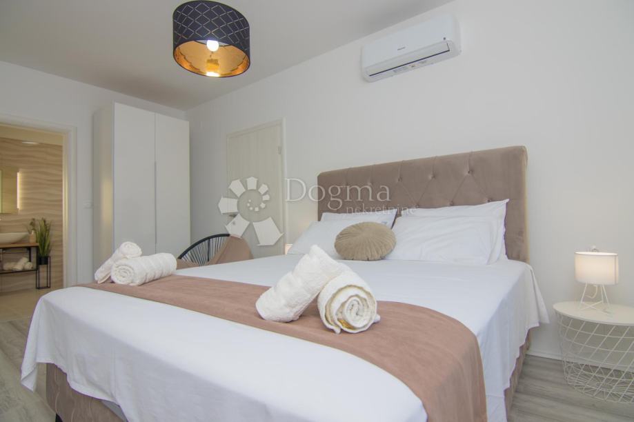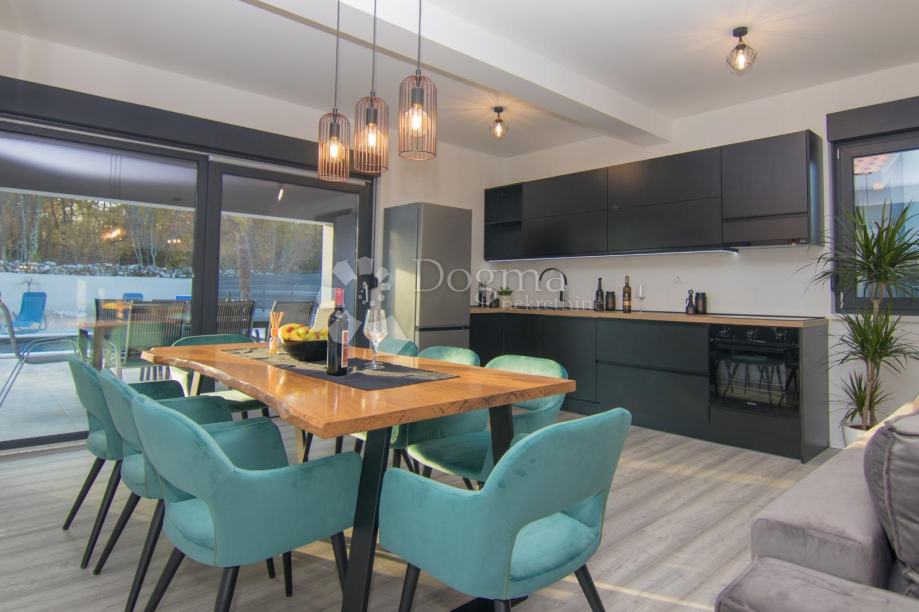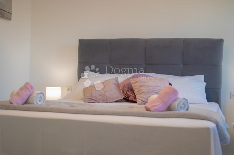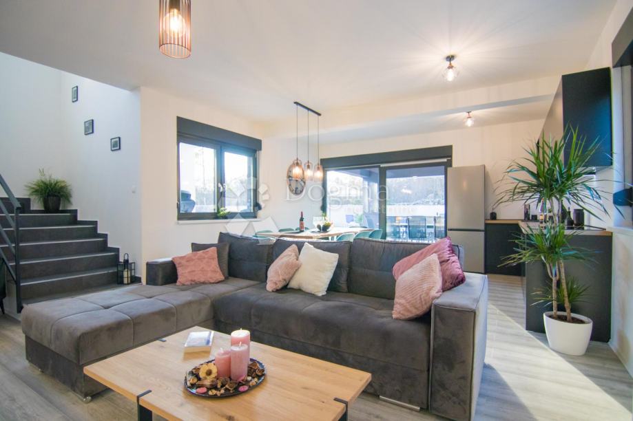 Na katu su smještene tri spavaće sobe, svaka sa svojom kupaonicom, dok je prizemlju dnevni boravak, blagovaonica, kuhinja, još jedna spavaća soba te spremište. Iz dnevnog dijela se izlazi u dvorišni dio gdje je smješten bazen te roštilj i sunčalište. Moderno opremljeno i potpuno namješteno!
