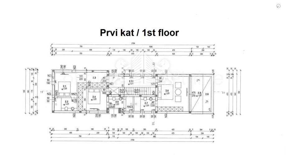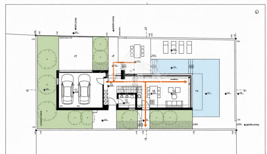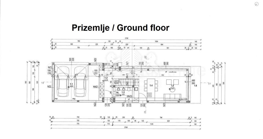 U prizemlju površine 126,40 m² nalazi se reprezentativni ulazni prostor, moderno uređena kuhinja s blagovaonicom i prostranim dnevnim boravkom otvorenog koncepta, gostinjski WC te garaža s dva parkirališna mjesta. Unutarnje stepenice vode na prvi kat površine 110,40 m², gdje su smještene tri prostrane spavaće sobe, pri čemu svaka soba ima vlastitu en-suite kupaonicu, dok master spavaća soba dodatno raspolaže i natkrivenom terasom s pogledom na more.