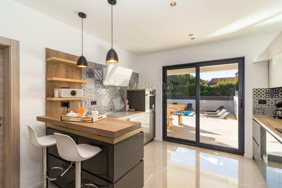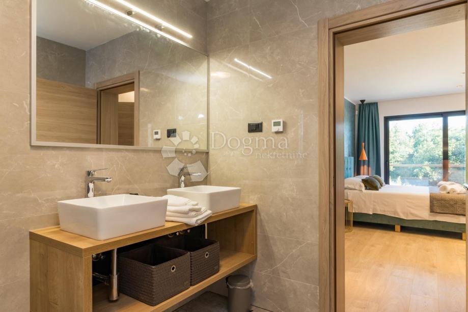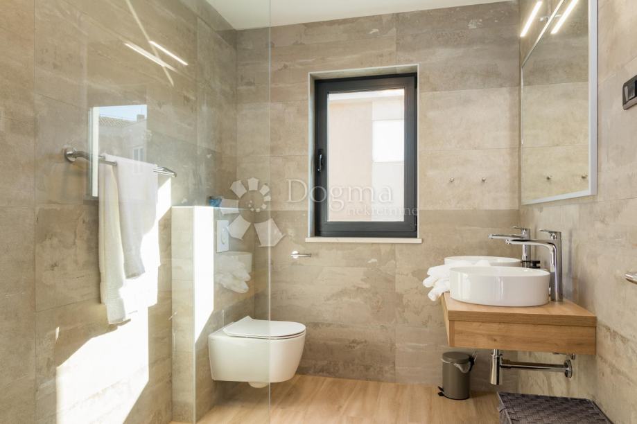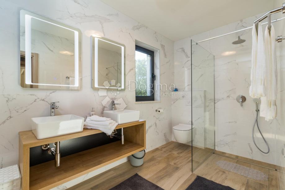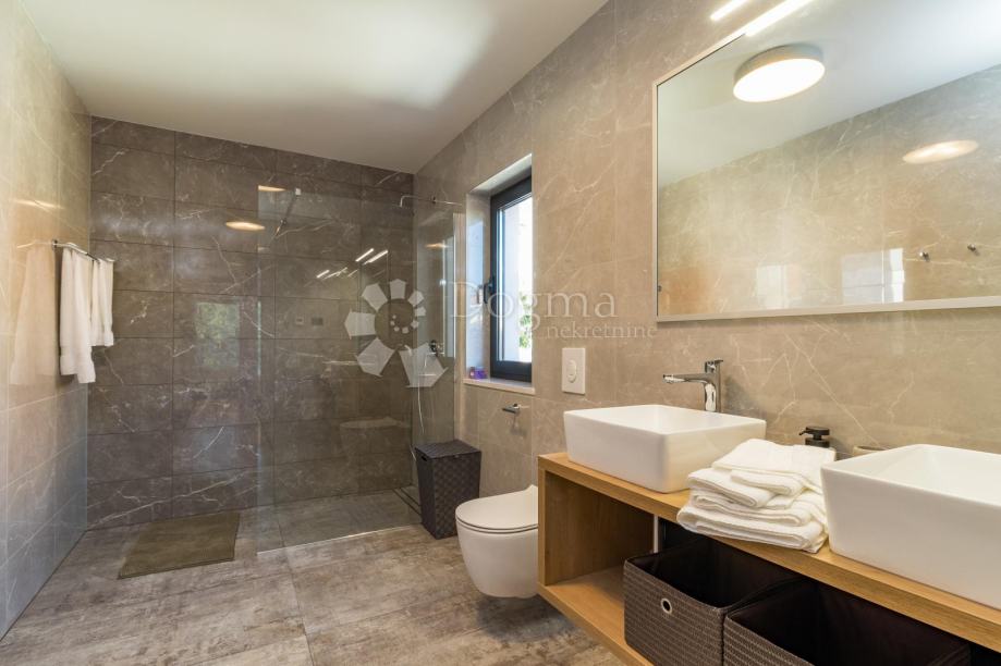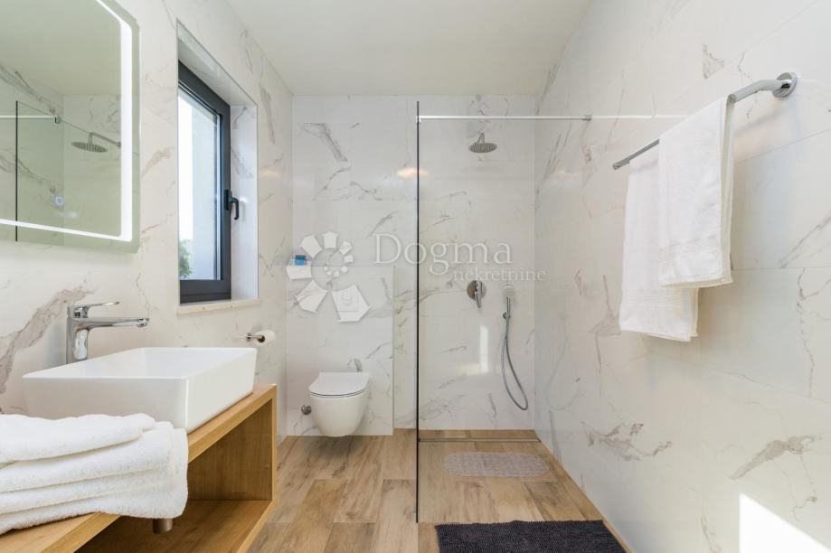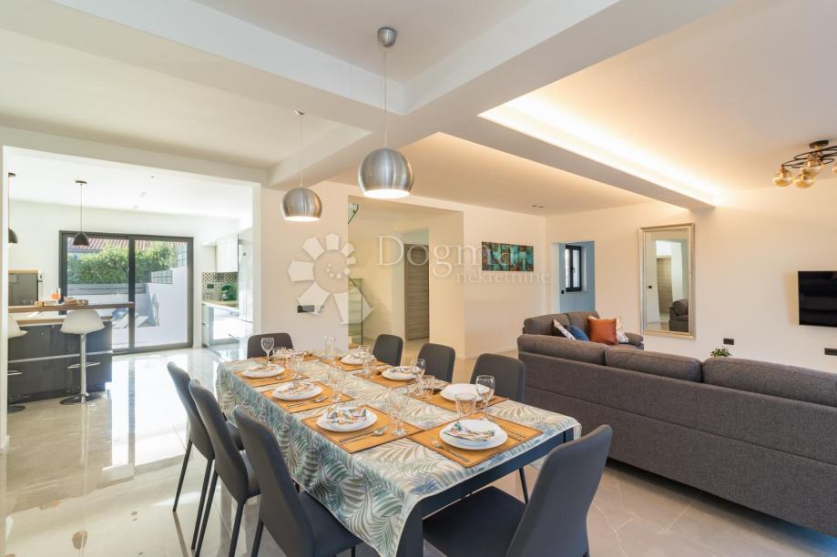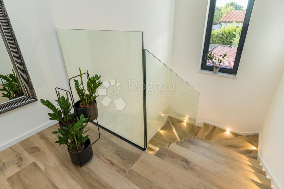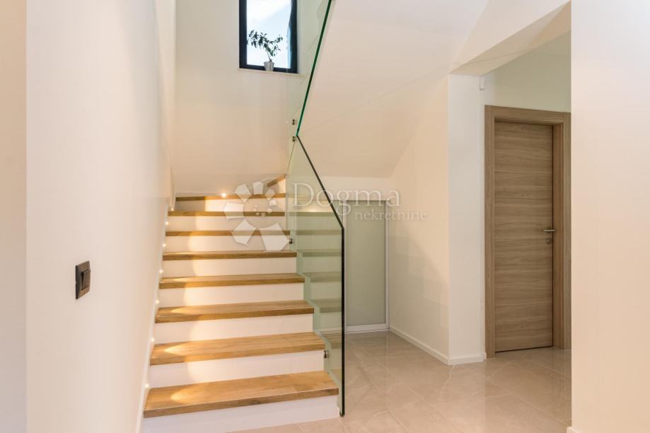 Ukupna stambene površina je 293 m² te se sastoji od prizemlja i kata. U prizemlju nalazi se prostrana moderna kuhinja, vrhunski dizajnirana i rađena po mjeri, prostrani dnevni boravak za maksimalno opuštanje i uživanje u dobrom društvu, fitness zona te izlaz na veliku popločenu terasu na kojoj se nalazi grijani bazen od 40 m²!