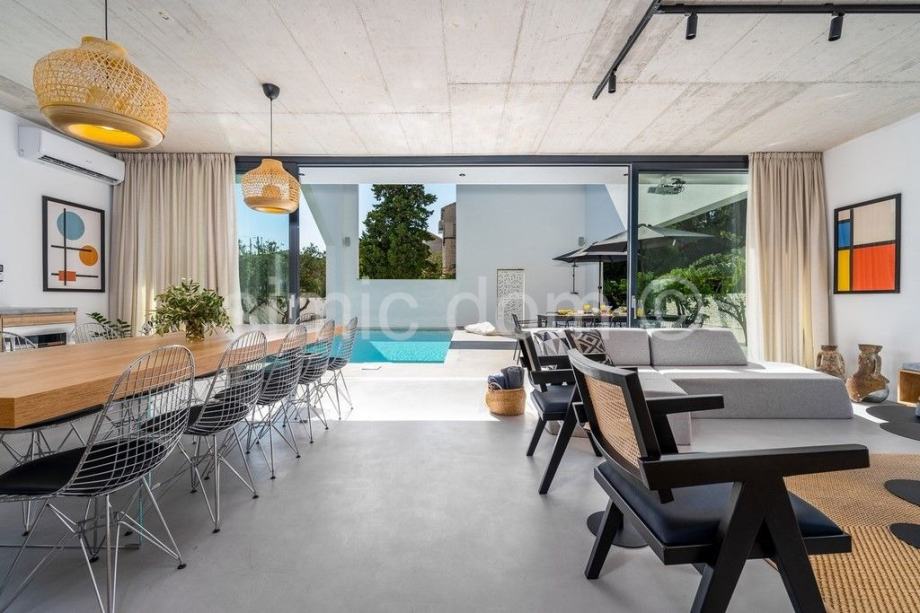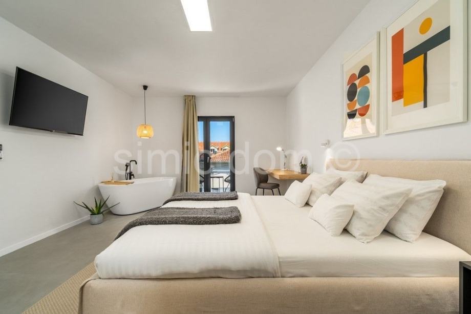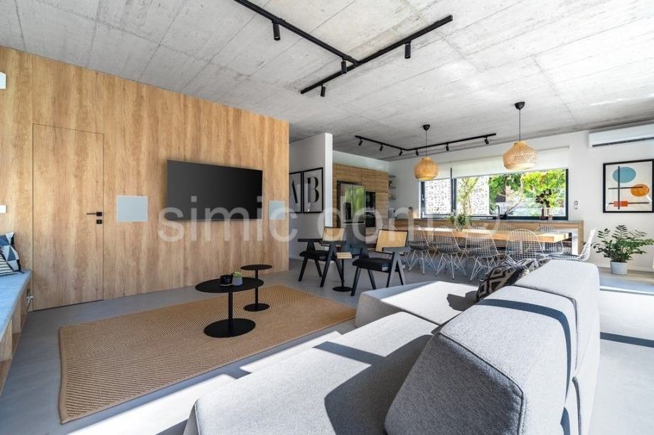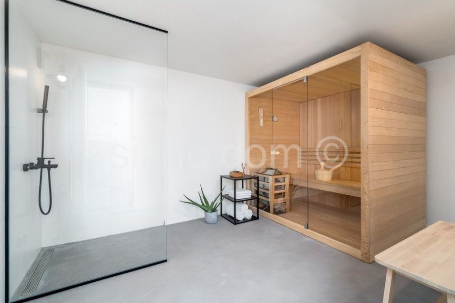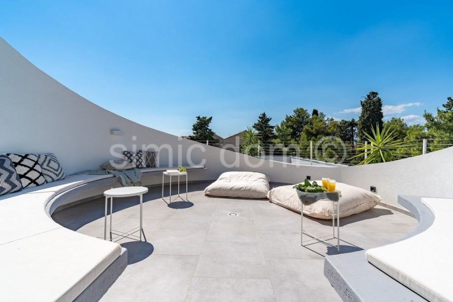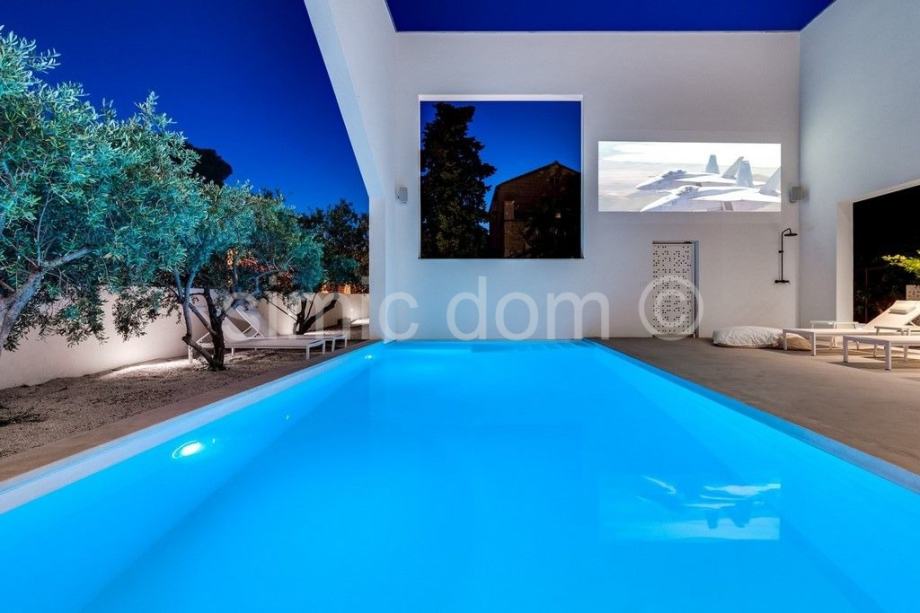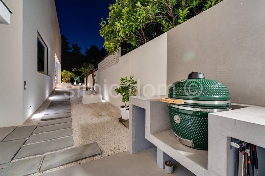 Nekretnina se prodaje luksuzno opremljena i namještena, u potpunosti je klimatizirana, a dnevni prostor ima i podno grijanje. Zahvaljujući velikim staklenim stijenama, interijer obiluje prirodnim svjetlom. U vanjskom dijelu nekretnina sadrži predivan mediteranski vrt, kino projektor s ozvučenjem, grijani bazen sa sustavom hidromasaže, sunčalište, vanjski tuš i roštilj. Otvoreni prostor krova sadrži predivan lounge prostor. Privatni parking može primiti najmanje 4 automobila, a postavljen je i video nadzor.