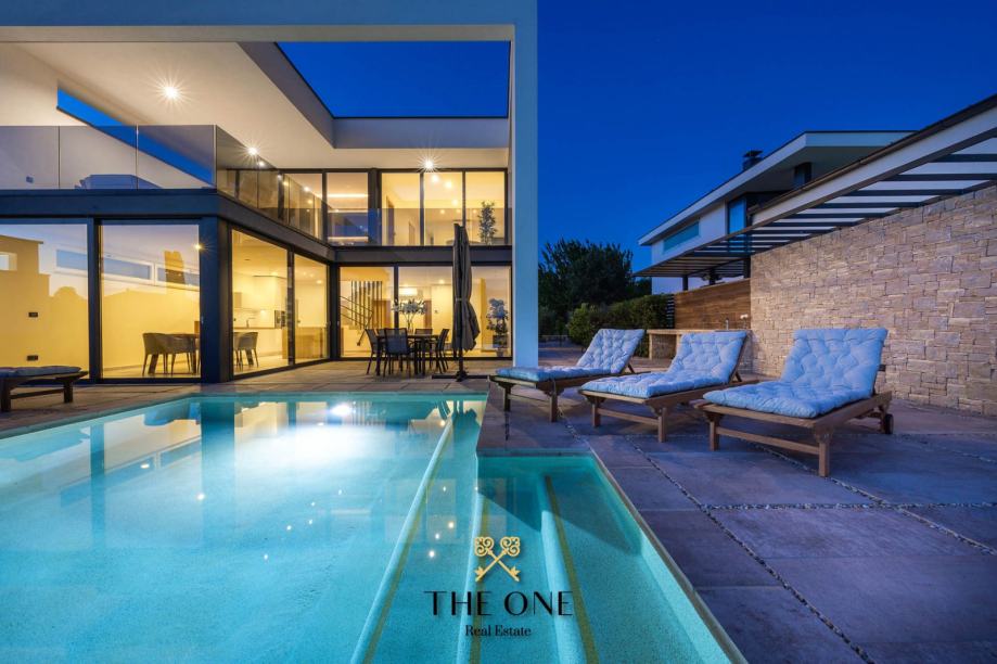 Elegantna vila nudi panoramski pogled na more i oduzima dah svojom modernom arhitekturom i besprijekornom izvedbom. Vila se prostire na dvije etaže ukupne površine 245m², što pruža dovoljno prostora za ugodan život.