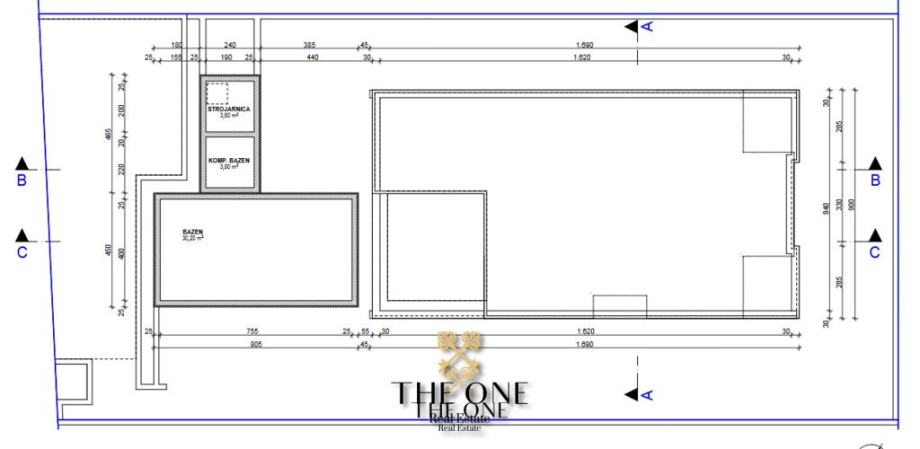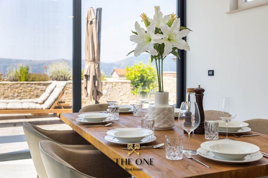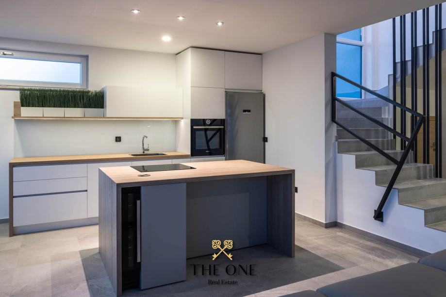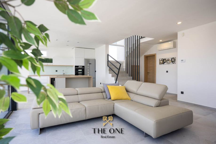 Ulaz vodi u prostrani, svijetli otvoreni prostor koji objedinjuje dnevni boravak, kuhinju i blagovaonicu. Središnji dio vile je direktno povezan s terasom s pogledom na bazen od 30m², okružen sunčalištem i savršeno je mjesto za uživanje u toplim ljetnim danima.