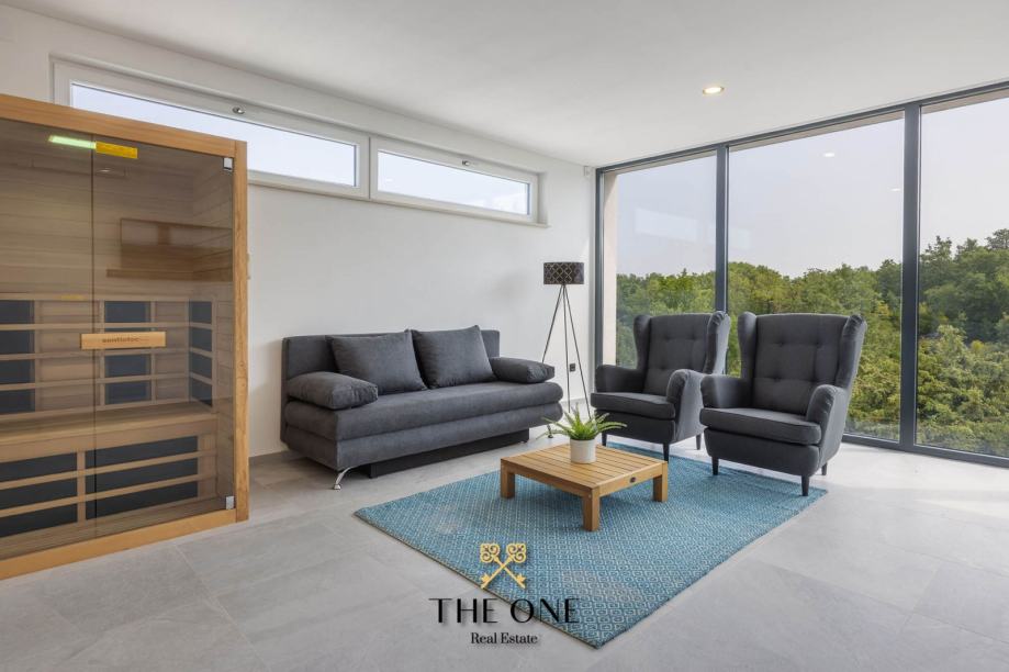 Na prvom katu nalazi se raskošna glavna spavaća soba s elegantnom kupaonicom, modernom skandinavskom saunom u kupaonici i prostranom terasom s prekrasnim pogledom na more. Osim toga, na istoj etaži nalazi se dodatni dnevni boravak s prekrasnim pogledom na šumu.