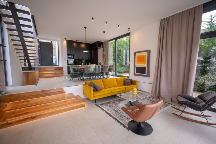 The villa offers 260 m² of living space on a 445 m² plot, with a contemporary architectural design that harmoniously blends stone, glass, and the Mediterranean surroundings. The cascading structure follows the natural terrain, providing both privacy and unobstructed panoramic sea views.