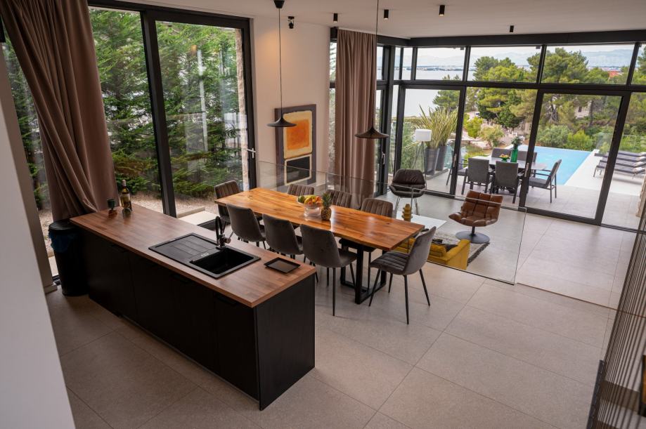 Unutrašnjost vile čini prostrani open-space dnevni boravak, moderna kuhinja s blagovaonicom te velika staklena stijena koja omogućuje obilje prirodnog svjetla i spektakularan pogled na more i okolne otoke. Iz dnevnog boravka izlazi se na veliku terasu s infinity bazenom koji pruža jedinstven doživljaj zalaska sunca nad Jadranom.