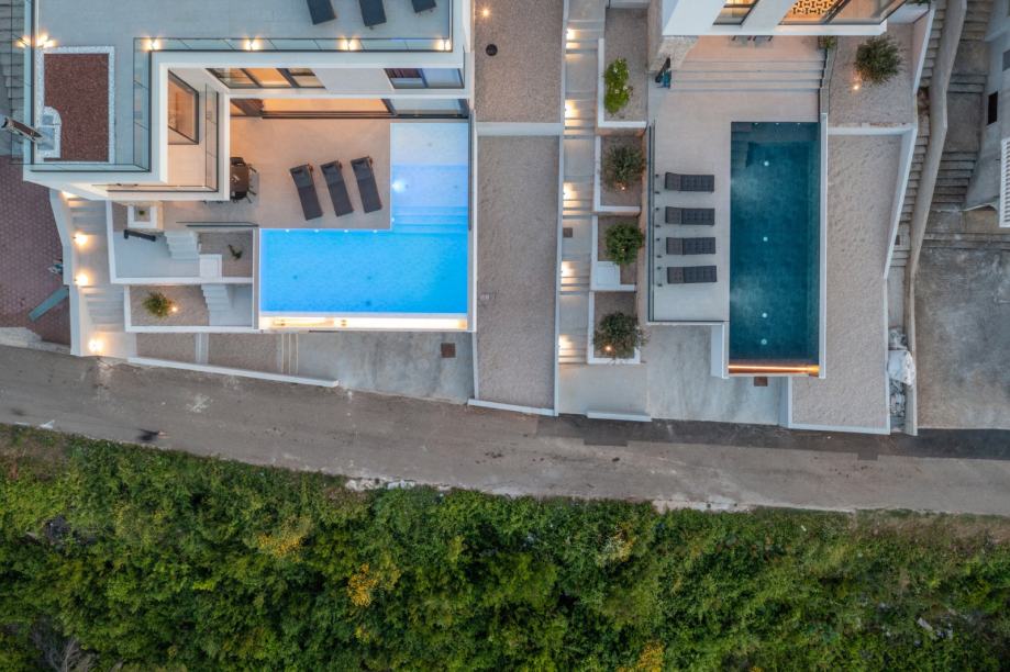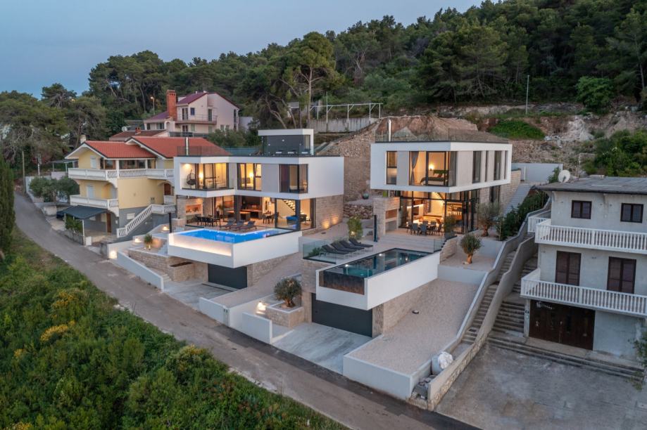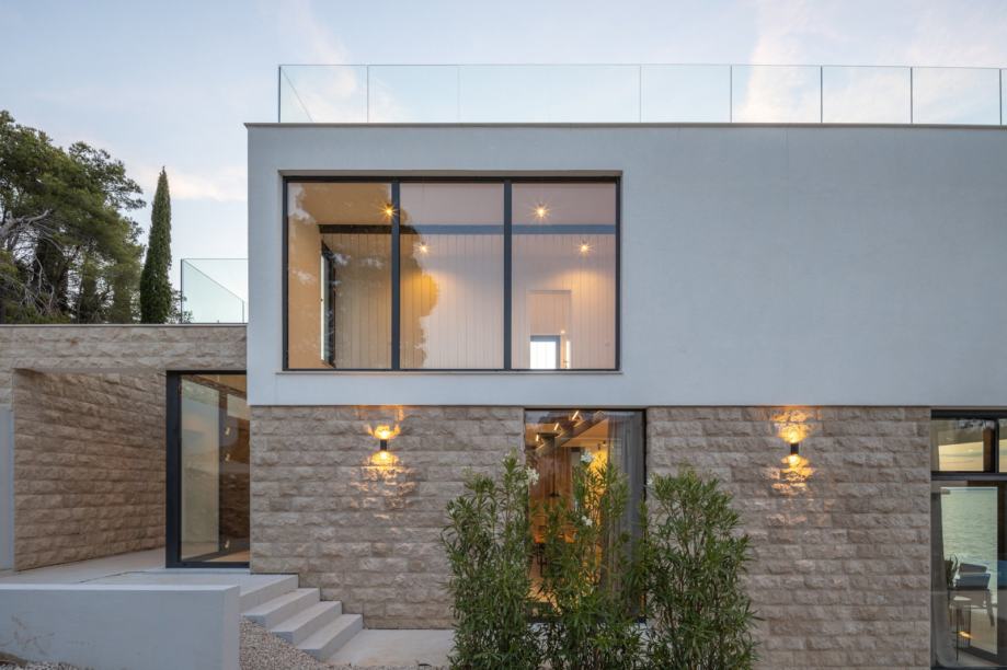 Vila se prostire na 260 m² stambene površine, izgrađena na parceli od 445 m², s pažljivo osmišljenim modernim dizajnom koji savršeno spaja kamen, staklo i more. Arhitektonski je oblikovana kaskadno, u skladu s prirodnim terenom i mediteranskim okruženjem, nudeći potpuni privatni ugođaj i luksuzan život uz more.