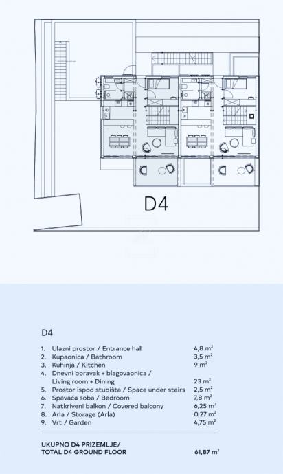 Donja etaža (61,87 m²) obuhvaća ulazni prostor, kupaonicu, kuhinju, blagovaonicu i dnevni boravak s izlazom na natkriveni balkon, prostor ispod stubišta, jednu spavaću sobu te vrt koji pruža dodatnu privatnost.