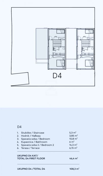 Gornja etaža (46,4 m², uključujući terasu s koeficijentom) sastoji se od stubišta i hodnika, dvije spavaće sobe, kupaonice i velike terase s mogućnošću uređenja vanjskog prostora za opuštanje ili druženje.