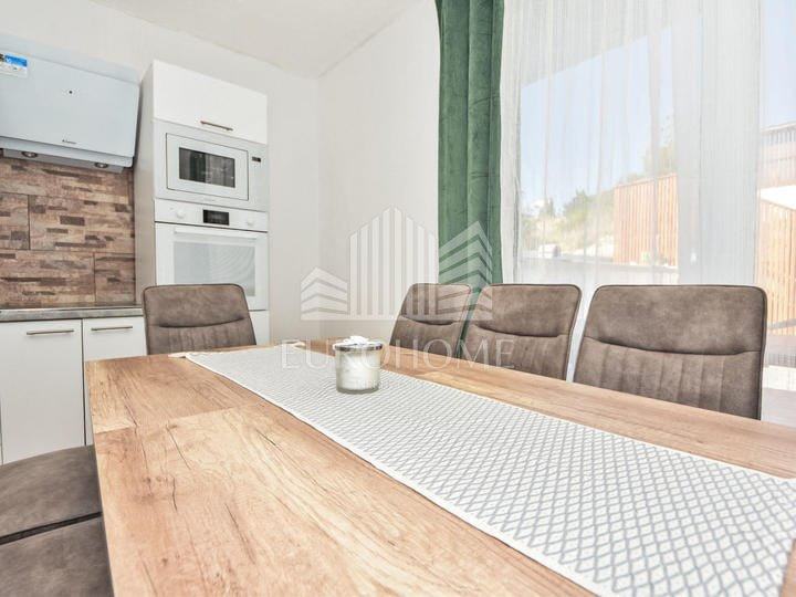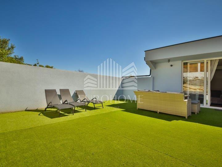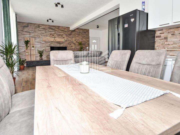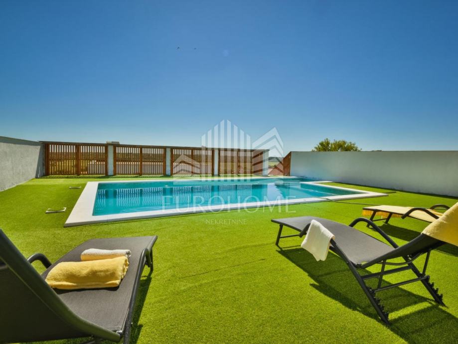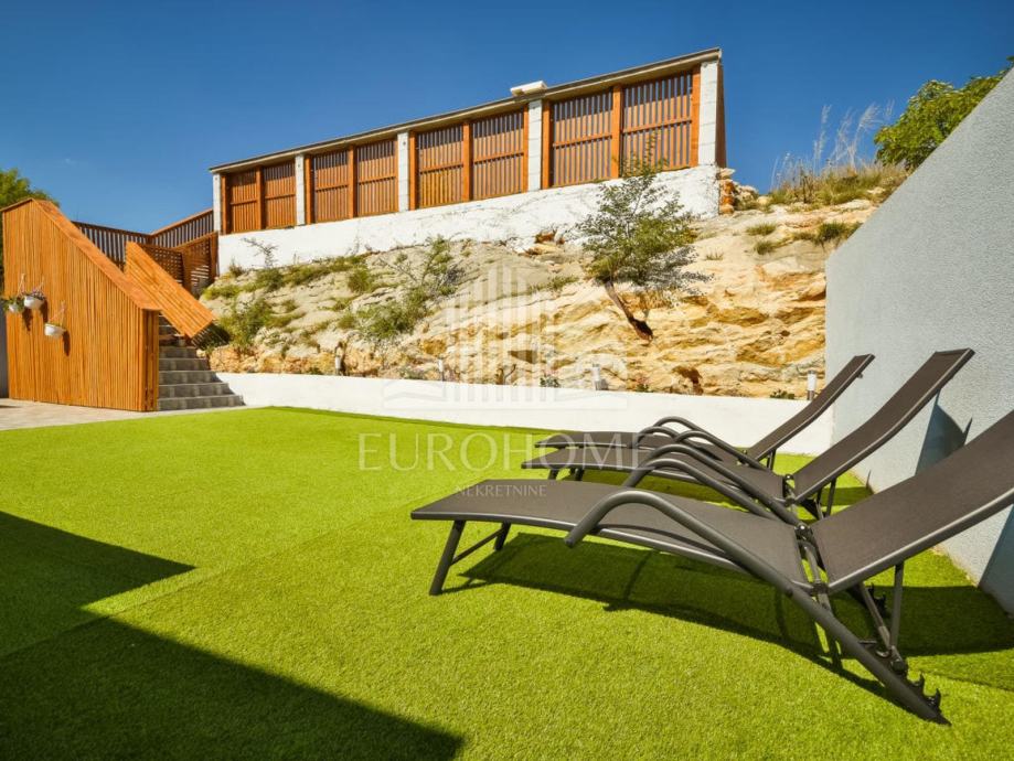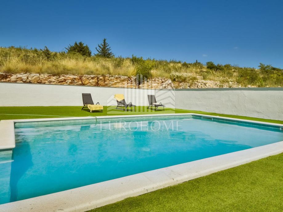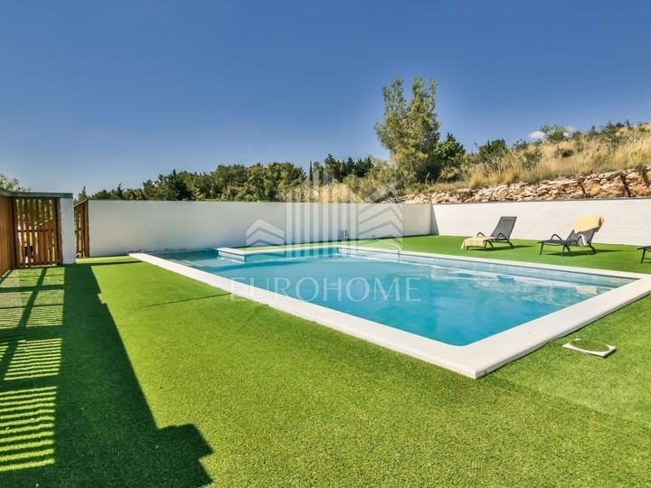 Kuća je završena i namještena trenutno je u turističkom najmu do kraja rujna , kuća posjeduje privatni bazen kao i sunčalište, dvije terase roštilj, vanjski šank
