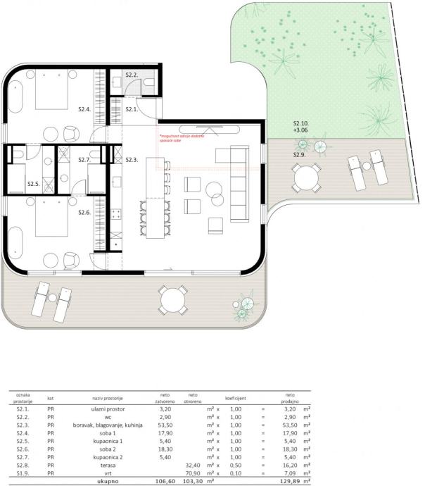 Sastoji se od: ulaznog prostora, gostinjskog wc-a, 2 spavaće sobe, 2 kupaonice, dnevnog boravka s blagovaonicom i kuhinjom (unutarnje površine 106,6m2), terase (32,4 m2) i vrta (70,9m2)