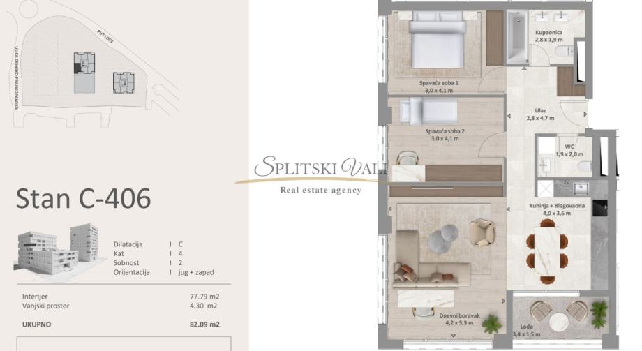 Stan C406 - Dvosoban stan ukupne površine 82,09 m2 nalazi se na 4. katu zgrade (od 6). Sastoji se od dvije spavaće sobe, kupatila, wc-a, kuhinje s blagovaonicom, dnevnog boravka i lođe. Velike staklene stijenke pružaju mnogo osvjetljenja tokom dana i lijep, otvoren pogled. Orijentacija stana je istok-zapad. Stanu pripadaju dva parking mjesta u garaži u iznosu od 35 000€ po svakom mjestu, te sprema koja se nalazi u suterenu zgrade u iznosu od 22 000€.