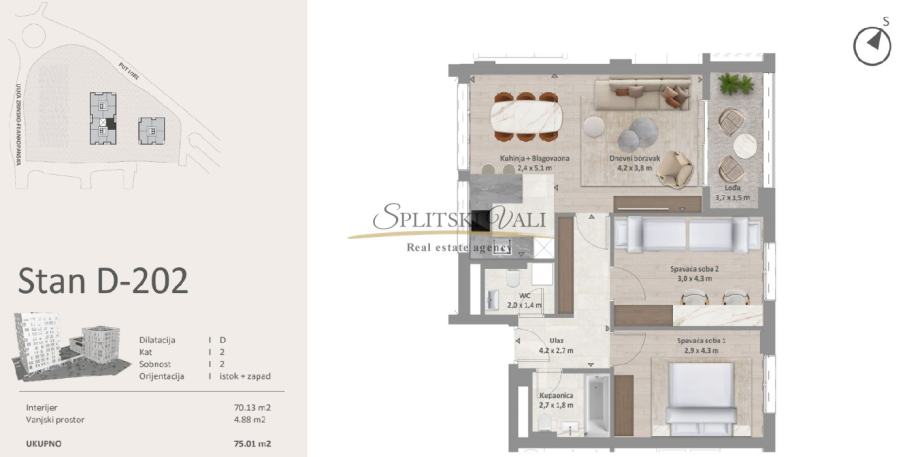 Stan D202 - Dvosoban prostran stan ukupne površine 75,01 m2 nalazi se na 3. i posljednjem katu zgrade. Sastoji se od dvije spavaće sobe, kupatila, wc-a, kuhinje s blagovaonicom, dnevnog boravka i lođe. Velike staklene stijenke pružaju mnogo osvjetljenja tokom dana. Orijentacija stana je istok-zapad. Stanu pripadaju dva parking mjesta u garaži u iznosu od 35 000€ po svakom mjestu, te sprema koja se nalazi u suterenu zgrade u iznosu od 22 000€.