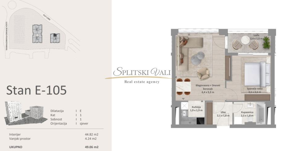 Stan E105 - jednosoban stan ukupne površine 49,06 m2, nalazi se na prvom katu od ukupnih 10. Stan je sjeverne orijentacije i sastoji se od spavaće sobe, kupatila, kuhinje, dnevnog boravka s blagovaonicom i lođe. Velike staklene stijenke u stanu pružaju mnogo osvjetljenja tokom dana. Stanu pripada i parking mjesto u garaži (35.000€) i sprema koja se nalazi u suterenu (22 000€).
