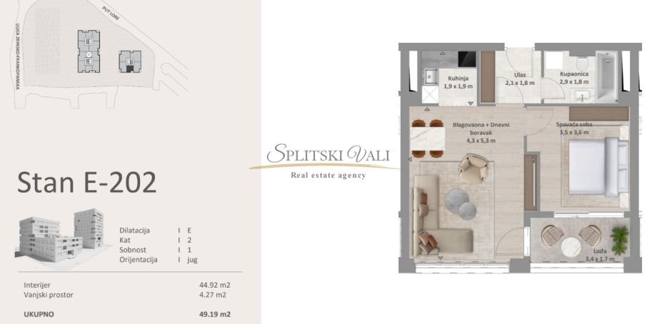 Stan E202 - jednosoban stan ukupne površine 49,13 m2, nalazi se na 2. katu (od ukupno 10 katova) zgrade. Stan je južne orijentacije i sastoji se od spavaće sobe, kupatila, kuhinje, dnevnog boravka s blagovaonicom i lođe. Velike staklene stijenke u stanu pružaju mnogo osvjetljenja tokom dana i otvoren pogled iz samog stana. Stanu pripada i parking mjesto u garaži (35.000€) i sprema koja se nalazi u suterenu (22 000€).