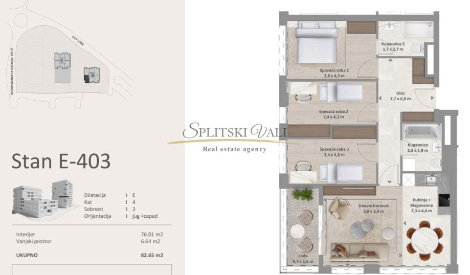Stan E403 - Trosoban stan, ukupne površine 82,65 m2 nalazi se na 4.katu (od 10) zgrade. Sastoji se od tri spavaće sobe, 2 kupatila, kuhinje s blagovaonicom, dnevnog boravka i lođe. Velike staklene stijenke pružaju mnogo osvjetljenja tokom dana i otvoren pogled. Orijentacija stana je jugozapad. Stanu pripadaju tri parking mjesta u garaži u iznosu od 35 000€ po svakom mjestu, te sprema koja se nalazi u suterenu zgrade u iznosu od 22 000€.