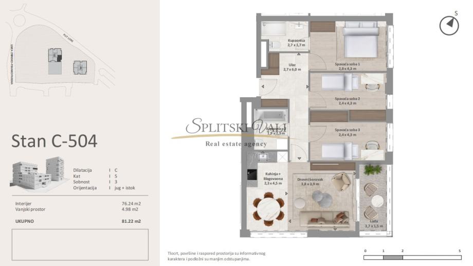 Stan C504 - Trosoban prostran stan ukupne površine 81,22m2 nalazi se na 5 katu zgrade od ukupno 6 katova. Stan se sastoji od tri spavaće sobe, 2 kupatila, kuhinje s blagovaonicom, dnevnog boravka i lođe. Velike staklene stijenke pružaju mnogo osvjetljenja tokom dana , i pružaju predivan pogled iz samog stana. Orijentacija stana je jugoistok. Stanu pripadaju tri parking mjesta u garaži u iznosu od 35 000€ po svakom mjestu, te sprema koja se nalazi u suterenu zgrade u iznosu od 22 000€. Razgled nekretnine moguć je isključivo uz potpisani Ugovor o posredovanju, a što je u skladu sa Zakonom o zaštiti podataka i Zakonom o posredovanju i prometu nekretninama. Kupac plaća posredničku naknadu od 2%+pdv. Za više informacija obratite se na 099 1600 416 Dino.