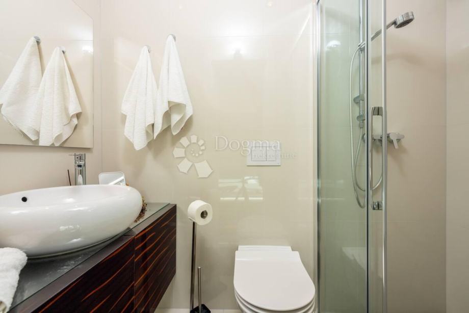 Apartman ima stambenu površinu 63 m2 koja se sastoji od open space dnevnog boravka, blagovaone i kuhinje, gostinjskog toaleta i 2 spavaće sobe s vlastitim kupaonama. Iz dnevnog boravka se izlazi na južnu terasu od 26 m2 koja je ograđena, popločana i uređena za druženje dok se iz spavaćih soba izlazi na sjeverni dio okućnice od 55 m2 koja je također uređena i na kojoj je smještena vrtna kućica, sunčalište i vanjski tuš. Apartmanu pripada 1 parkirno mjesto od 14 m2 iako je parking zgrade dovoljan za smještaj više vozila.