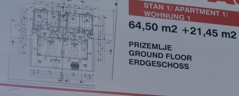 Prodajemo stan u kvalitetnoj novogradnji, smješten u prizemlju površine 64,50m2 koji se sastoji od dvije spavaće sobe, dnevnog boravka, kuhinje, kupaonice, hodnika i velike terase te dijela okućnice na kojoj se po zahtjevu kupca moze napraviti i bazen!