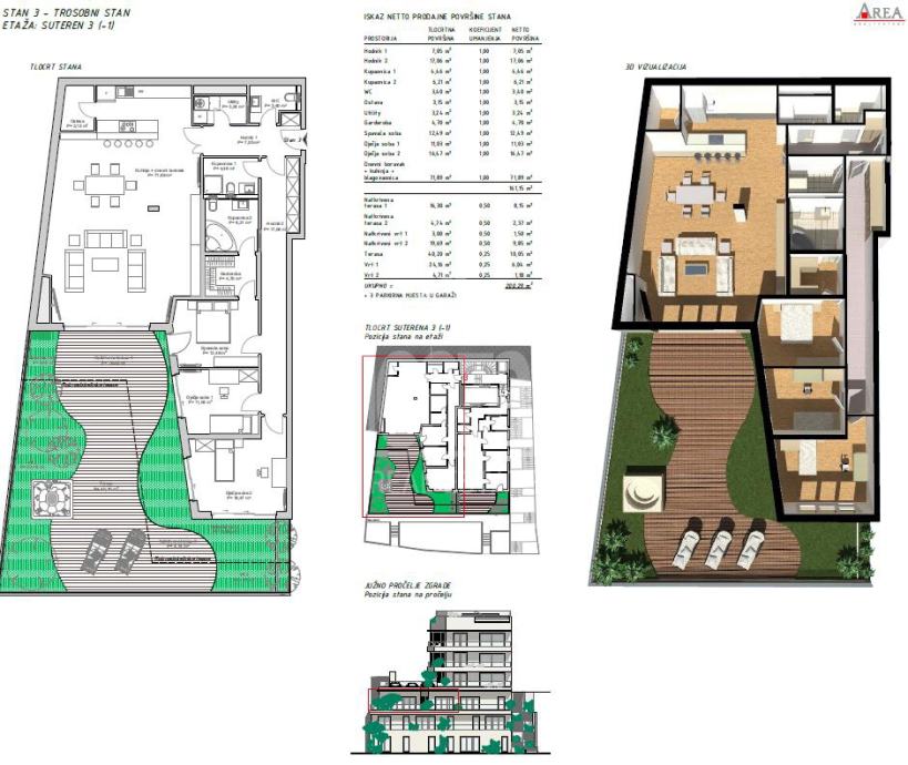 Stan 3 = 161,1 m2/suteren 3 (-1), trosobni stan sa dnevnim boravkom, dvije kupaonice i terasom od 112,28 m2 + 3 garažna parkirna mjesta (2 x 35.000 EUR, 1x40.000EUR), "KUĆA U KUĆI"