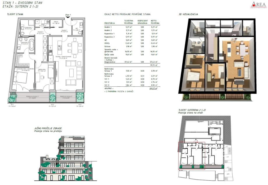 stan 1/suteren 2 (-2) = 99,70 m2 + terasa 16,47 m2 + 2 garažna parkirna mjesta