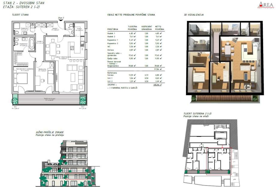 stan 2/suteren 2 (-2) = 97,83 m2 + terasa 16,48 m2 + 2 garažna parkirna mjesta