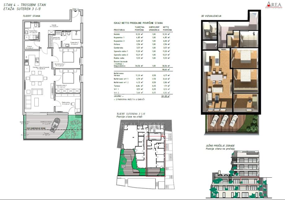stan 4/suteren 3 (-1) = 98,62 m2 + terasa 28,68 m2 + 2 garažna parkirna mjesta