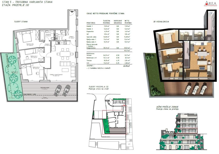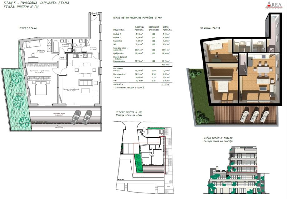 stan 5/0 priz (0) = 95,20 m2 + terasa 62,24 m2 + 2 garažna parkirna mjesta