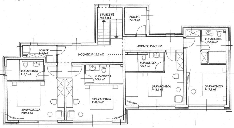 Na drugom katu su smještene prostrane četiri spavaće sobe po 18-19m2, svaka soba sa wc i kupaonicom 6m2.