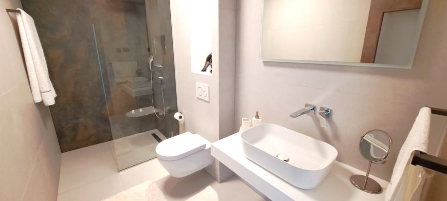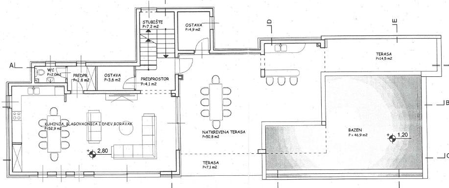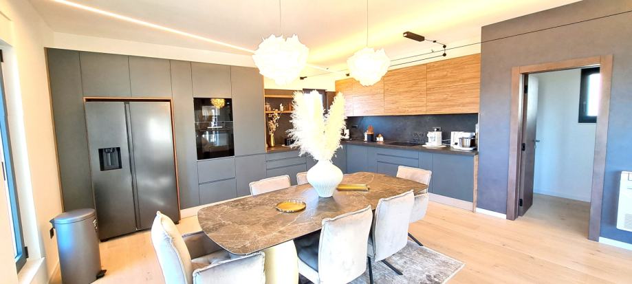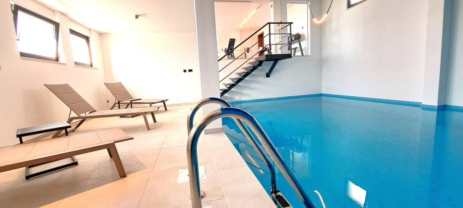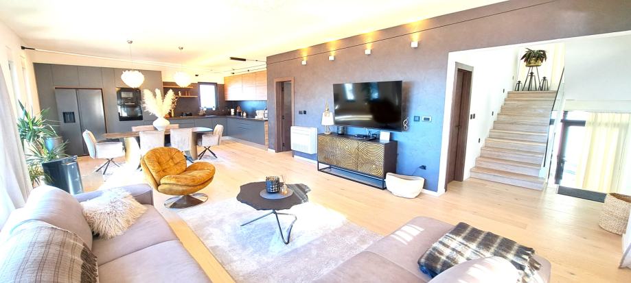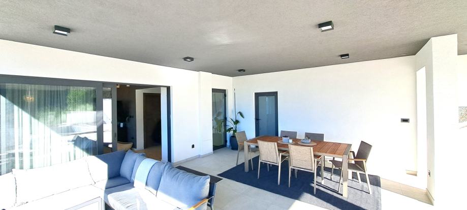 Na prvom katu smješten je prestižni dnevni boravak otvorenim konceptom povezan s modernom kuhinjom i blagovaonicom ukupne površine 60m2. Iz dnevnog boravka se pristupa na natkrivenu terasu sa vanjskim bazenom od 50m2, tu su i ljetna kuhinja i prostor za sunčanje sa potpunom privatnosti.