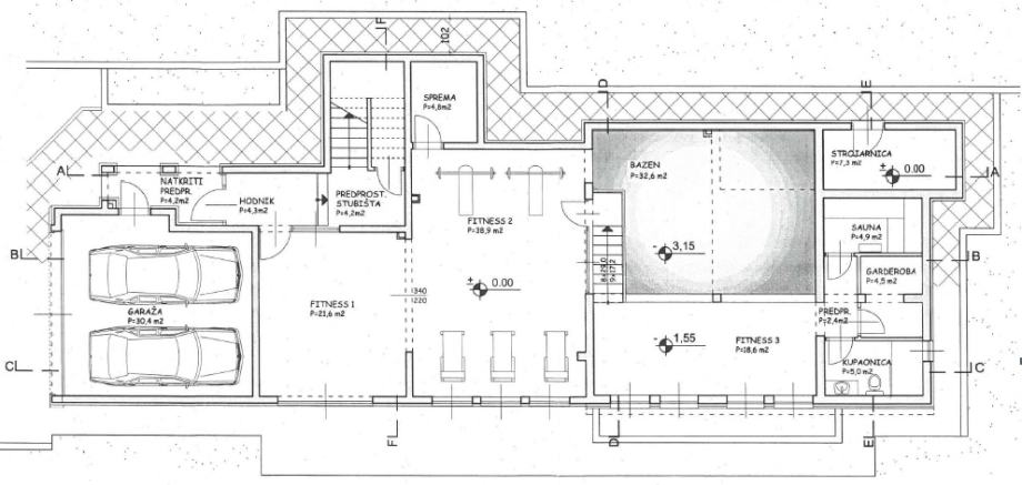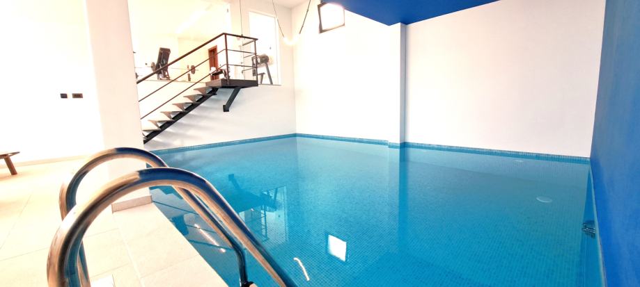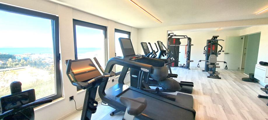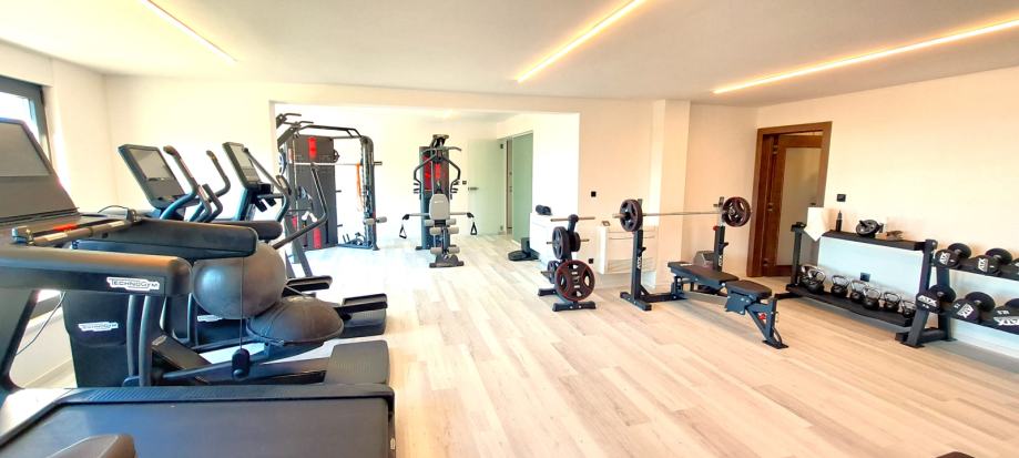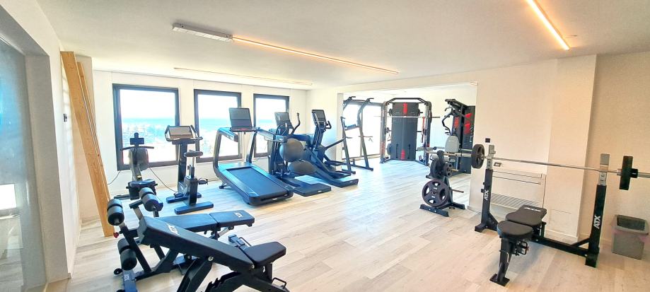 Prizemlje se sastoji od garaže za dva auta površine 30m2, opremljene teretane 80m2, odličnog zatvorenog zimskog bazena površine 33m2 i saune.