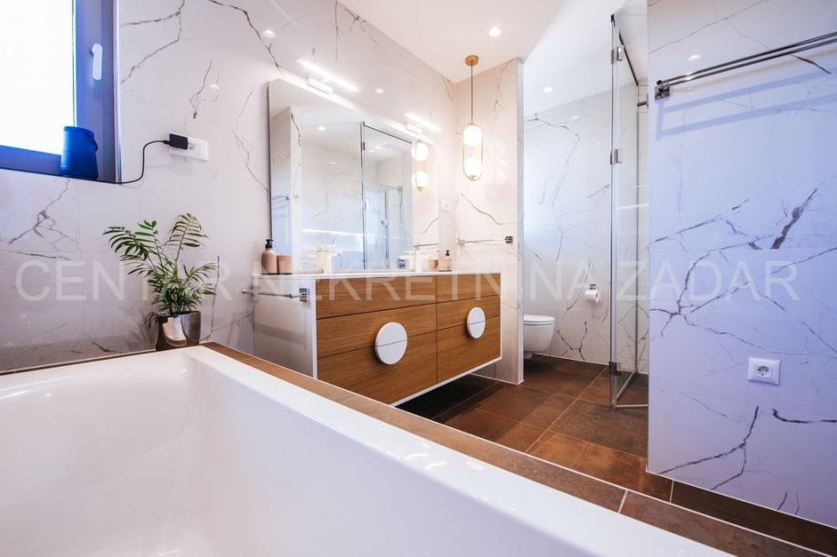 Kuća je građena najkvalitetnijim materijalima na tržištu, opremljena je podnim grijanjem, stropnim jedinicama klima uređaja te keramikom i parketom visoke kvalitete. Prostrana kuhinja sadrži aparate renomiranih svjetskih proizvođača Samsung i Bosch. Kuća ima termofasadu, a stolarija je pvc sa ugrađenim komarnicima i kliznim griljama. Okućnica je prostrana i pažljivo uređena mediteranskim raslinjem i stablima maslina.
