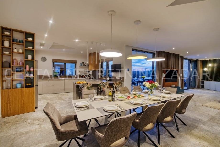 Na prodaju je jedinstvena novoizgrađena, moderno opremljena luksuzna vila sa bazenom u naselju Smoković, nedaleko Zadra. Izgrađena je na zemljištu ukupne površine 2850 m2. Ukupna stambena površina iznosi 276 m2, ima prostranu kuhinju, blagovaonicu i dnevni boravak, wc, praonicu te ukupno 5 spavaćih soba s vlastitim kupaonicama, opremljenim skupocjenom keramikom i sanitarijama te pomno odabranim namještajem izrađenim po mjeri. Dnevni boravak ima izlaz na veliku terasu pored bazena dimenzija 11x5, gdje se također nalazi vanjski tuš, jacuzzi te prostor za zabavu. Ispod bazena smještena je strojarnica bazena, a u sklopu tog prostora može se urediti i sauna ili teretana. Pored bazena nalazi se dodatni objekt u kojem je smješten prostor za roštilj sa wc-om, spavaća soba s kupaonicom te spremište. U sklopu kuće nalaze se i dvije garaže.