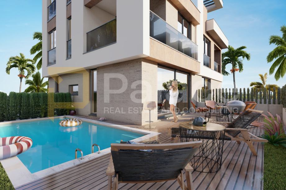 - privatni bazeni dodatno naglašavaju luksuzni karakter objekta, a u ovoj jedinici bazen se nalazi u prizemlju i savršeno je uklopljen u elegantno uređeno dvorište, stvarajući osjećaj privatnog ljetovališta