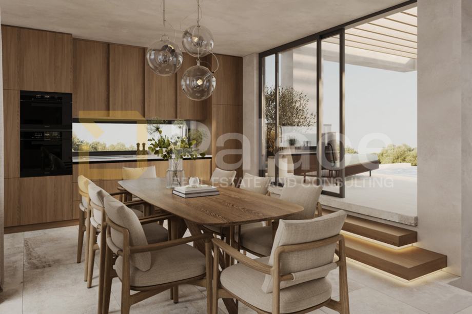 U prizemlju se nalazi sofisticirana dnevna zona, prostrani otvoreni koncept kuhinje s blagovaonicom i dnevnim boravkom s direktnim izlazom na dvorište i bazen. Na prvom katu smještene su dvije spavaće sobe, svaka sa svojom kupaonicom. Treća spavaća soba nalazi se na drugom katu, također s vlastitom kupaonicom i izlazom na terasu s jacuzzijem i prostorom za uživanje.