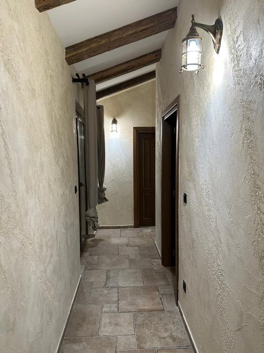 U ponudi je prekrasna rustikalna vila, vrlo kvalitetno izgrađena, kamena sa masivnim drvetom, za pravi primorski ugođaj. Vila se sastoji od 3 spavaće sobe, 3 kupaone, od toga su 2 u spavaćoj sobi, dnevnog boravka, kuhinje, a na parceli je i dodatni objekt koji se može koristiti kao spremište ili zasebna jedinica poput konobe, ili za prostor za druženje i slično. Površina vile je 150m2, sa pomoćnim objektom/konobom i nadstrešnicama 220m2, a okućnica je površine otprilike 450m2. Vila ima ugrađeno podno grijanje Vaillant, postavljeno u cijeloj kući, vrlo visoke kvalitete.Za stolariju je investitor odabrao njemački profil Salamander, kojega odlikuju troslojno staklo i vrlo kvalitetna izrada i materijal. Mitsubishi Klime, video nadzor, namještaj kompletno u masivnom hrastu, zidovi u posebnoj tehnici bojanja, original Jacuzzi, samo su neke od odlika ove prekrasne vile i čine ju jedinstvenom nekretninom na ovome području. Na okućnici se nalazi bazen površine 32,5m2, u mozaiku i sa vodopadom, a unutra je slana voda i postavljena vrhunska tehnika, kao i grijanje bazena. Vanjski kamin je u kamenu i oko njega je prostor za druženje, natrkiven kamenom nadstrešnicom, dok su ulazna vrata u dvorište posebno naručena i jedinstvene su izrade, sa vrhunskim motorima. Parking pruža dovoljno prostora za smještaj do 5 vozila i to natkriveni. Vlasništvo uredno, 1/1 i dokumentacija uredna, kuća ima sve potrebno da bi bila vrhunska nekretnina i za život i za najam.