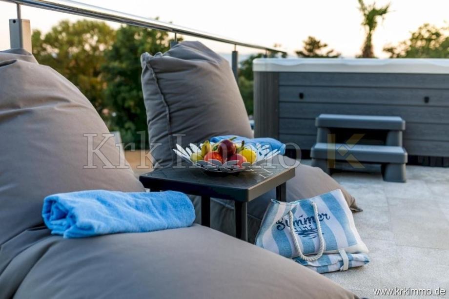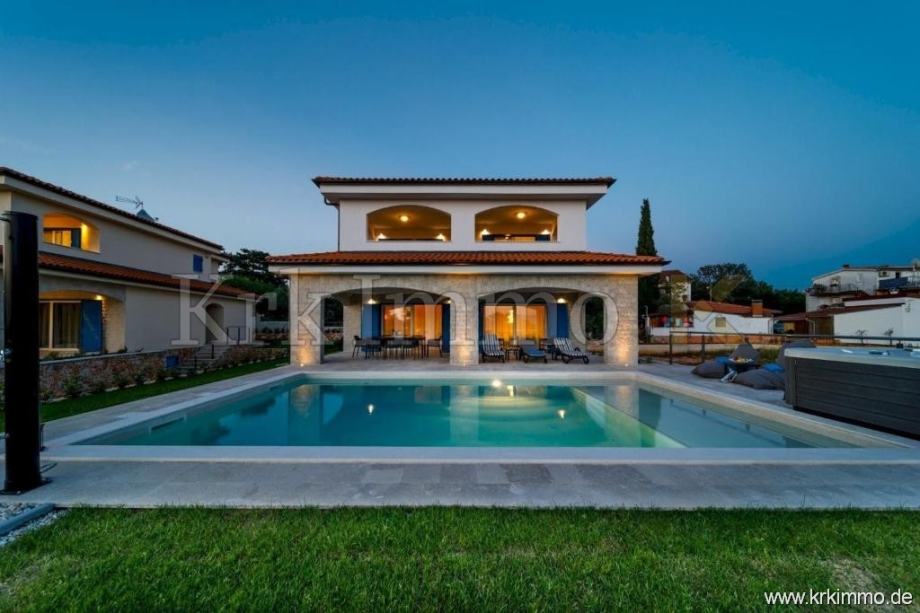 Uređena i ograđena okućnica nudi potpuni mir i privatnost, dok brojni sadržaji poput grijanog bazena na elektrolizu, jacuzzija, sunčališta, vanjskog tuša i roštilja pretvaraju ovu nekretninu u osobni raj. Na raspolaganju je i više parkirnih mjesta, što dodatno podiže razinu komfora.